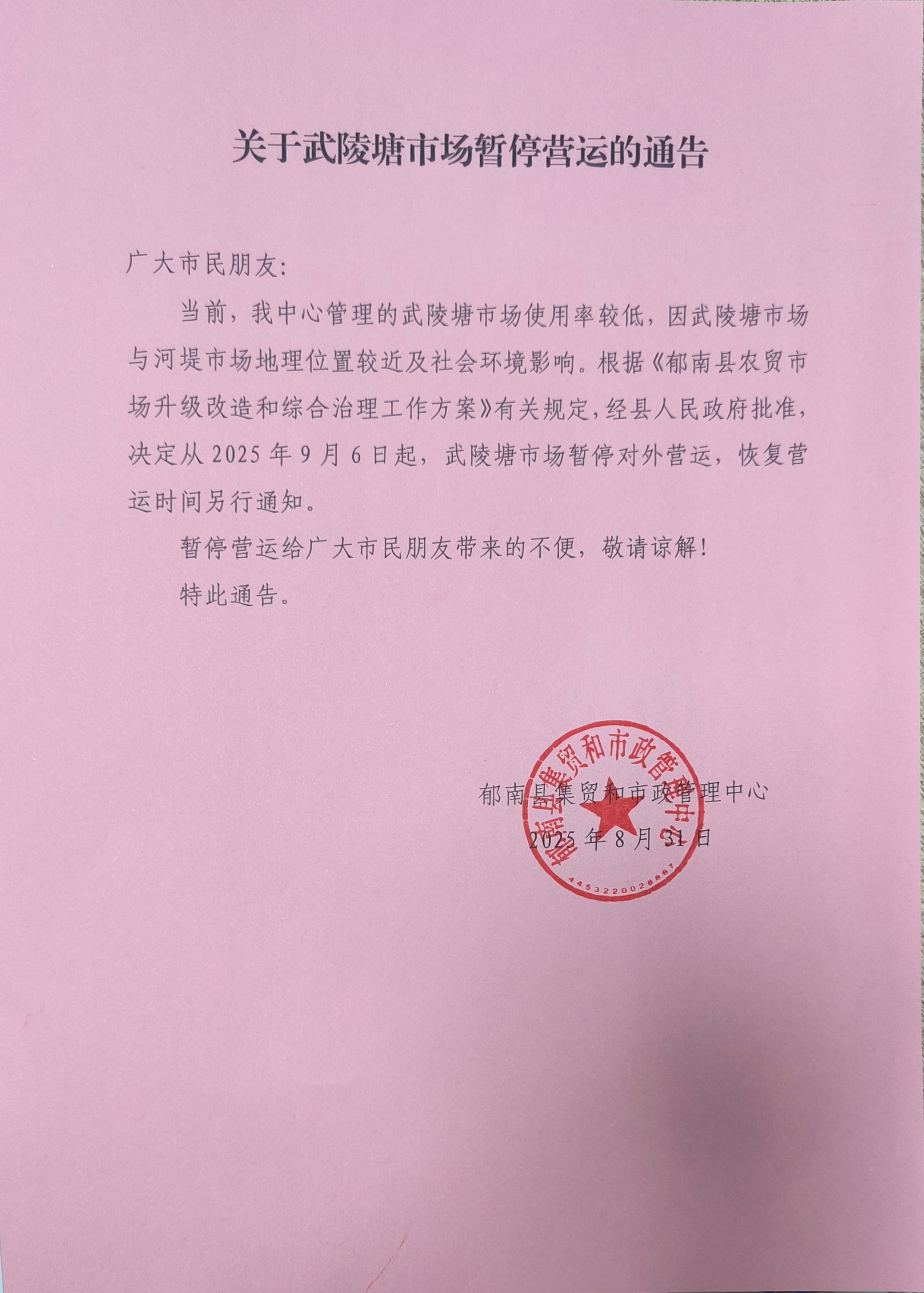 當前,我中心管理的武陵塘市場使用率較低,因武陵塘市場與河堤市場地理位置較近及社會環(huán)境影響。根據(jù)《郁南縣農(nóng)貿(mào)市場升級改造和綜合治理工作方案》有關規(guī)定,經(jīng)縣人民政府批準,決定從2025年9月6日起,武陵塘市場暫停對外營運,恢復營運時間另行通知。