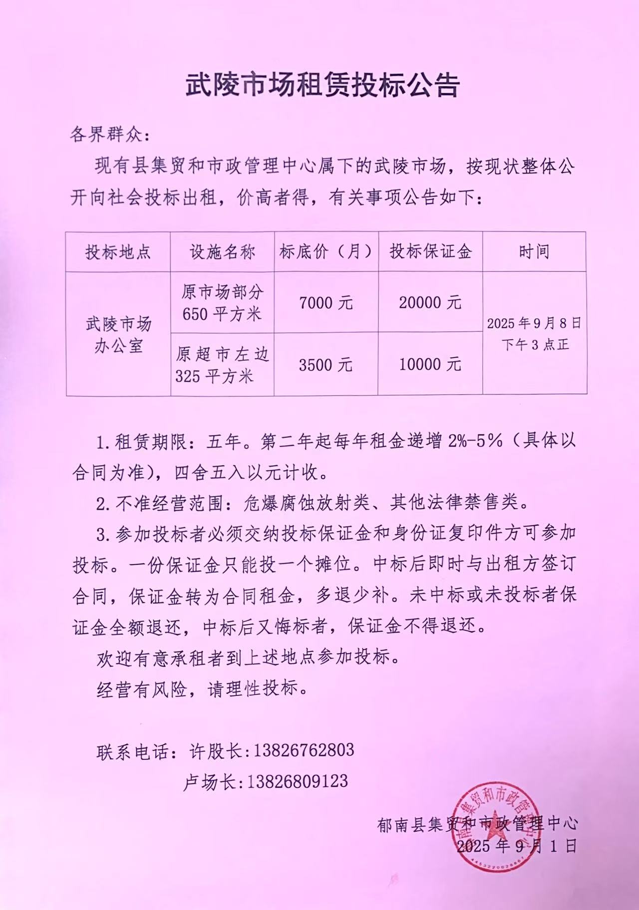 現(xiàn)有縣集貿(mào)和市政管理中心屬下的武陵市場,按現(xiàn)狀整體公開向社會投標出租,價高者得,有關事項公告如下:
