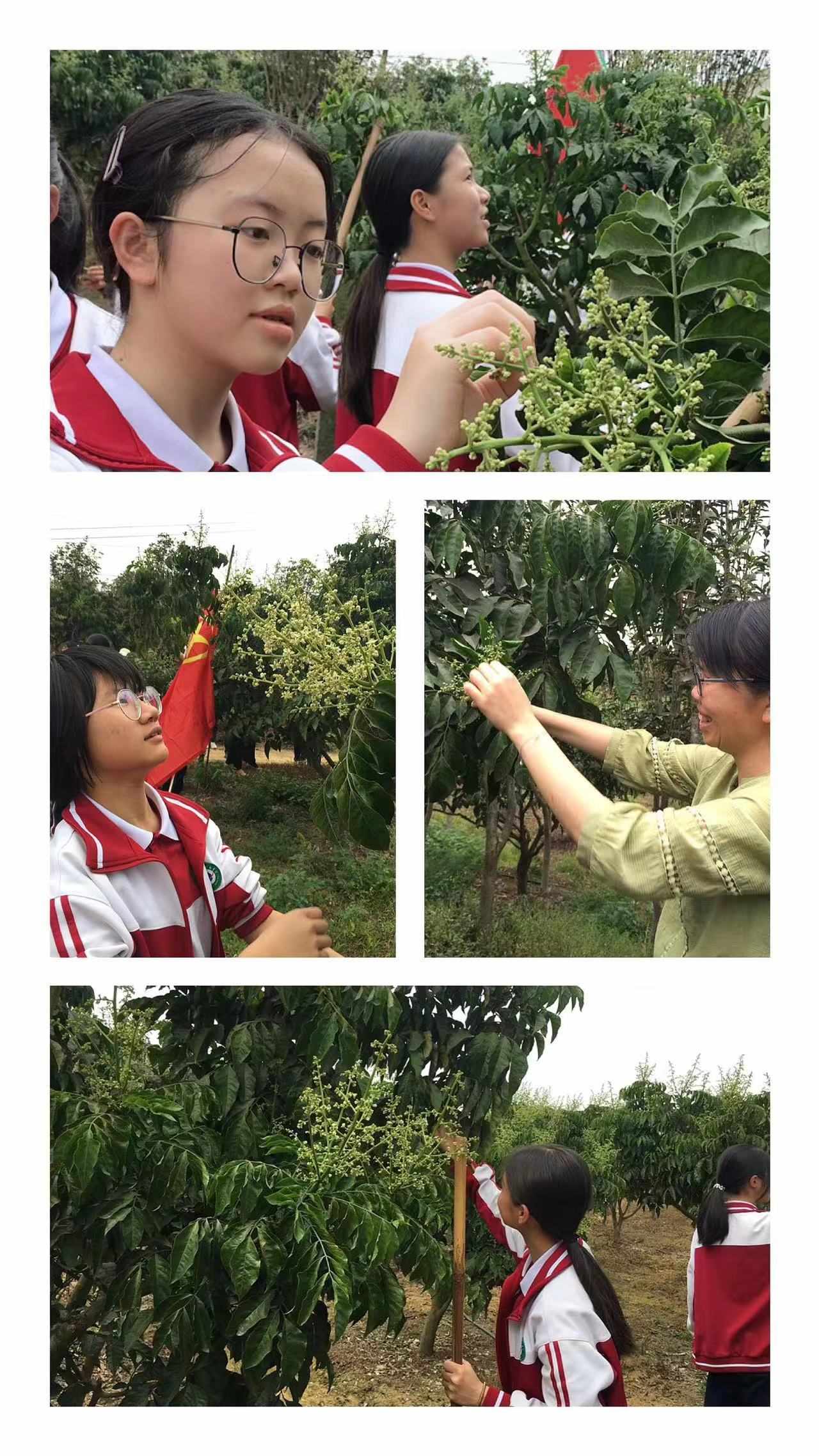 掛牌儀式結(jié)束后,參加活動的師生有序進入果園,在果園指導老師的帶領下,為黃皮花去花端。期間,同學們認真學習農(nóng)業(yè)知識,認識到去花端對黃皮果產(chǎn)量和質(zhì)量的影響,并積極動手忘我地投入勞作。同學們忙得不亦樂乎,盡管衣服上沾滿了泥土,但是每個人的臉上都洋溢著歡快的笑容,開心地看著自己的勞動成果。