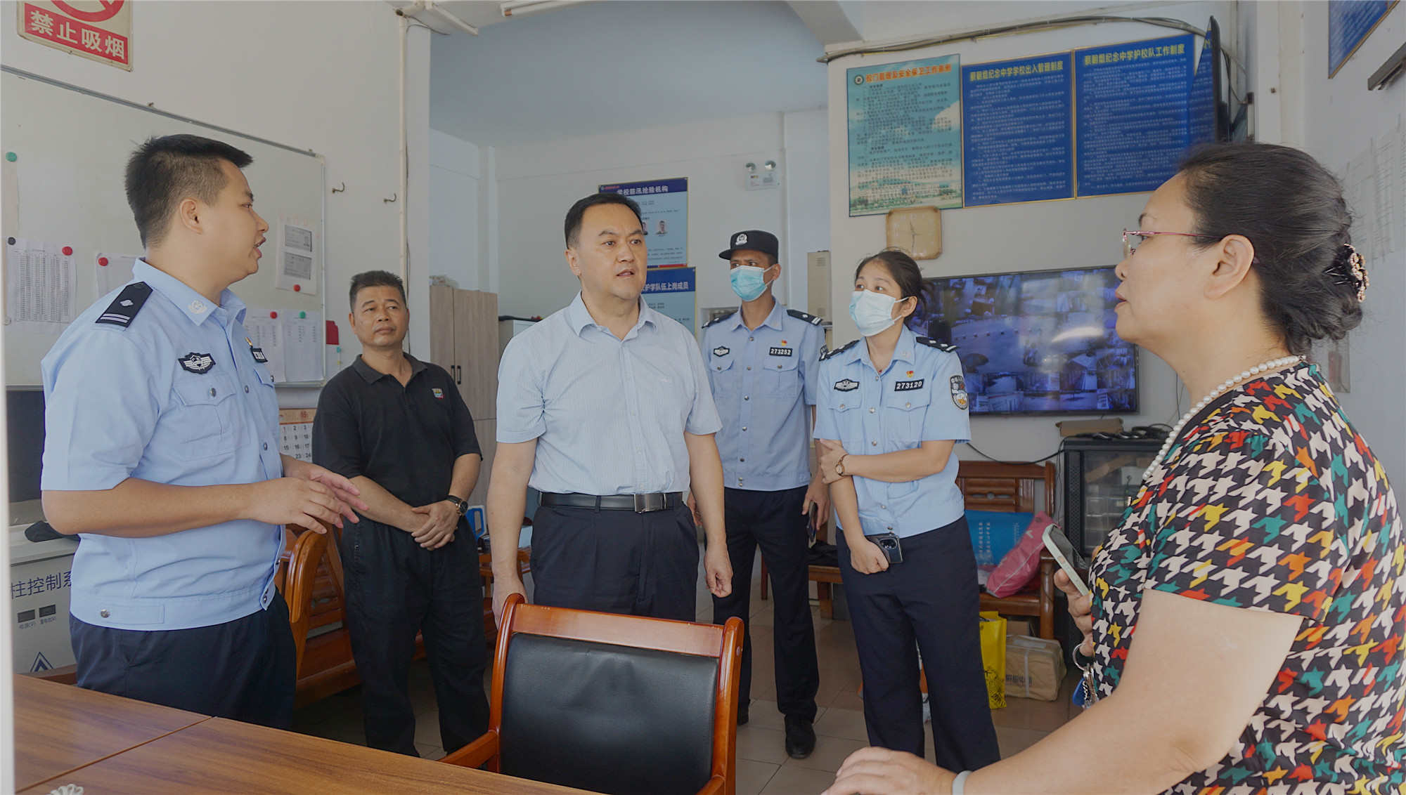 2023年5月26日上午,郁南縣副縣長(zhǎng)、縣公安局黨委書(shū)記、局長(zhǎng)王朝輝帶領(lǐng)縣公安局有關(guān)負(fù)責(zé)同志蒞臨蔡朝焜紀(jì)念中學(xué)高考考點(diǎn)進(jìn)行2023年高考考點(diǎn)安全工作檢查。檢查中,王朝輝同志一行對(duì)校園最小應(yīng)急單元、視頻監(jiān)控、一鍵報(bào)警裝置、校園管制刀具、外來(lái)人員管理、校園周邊環(huán)境等工作進(jìn)行了詳細(xì)檢查,為創(chuàng)建2023年平安高考、暖心高考、健康高考提供了堅(jiān)實(shí)的保障。
