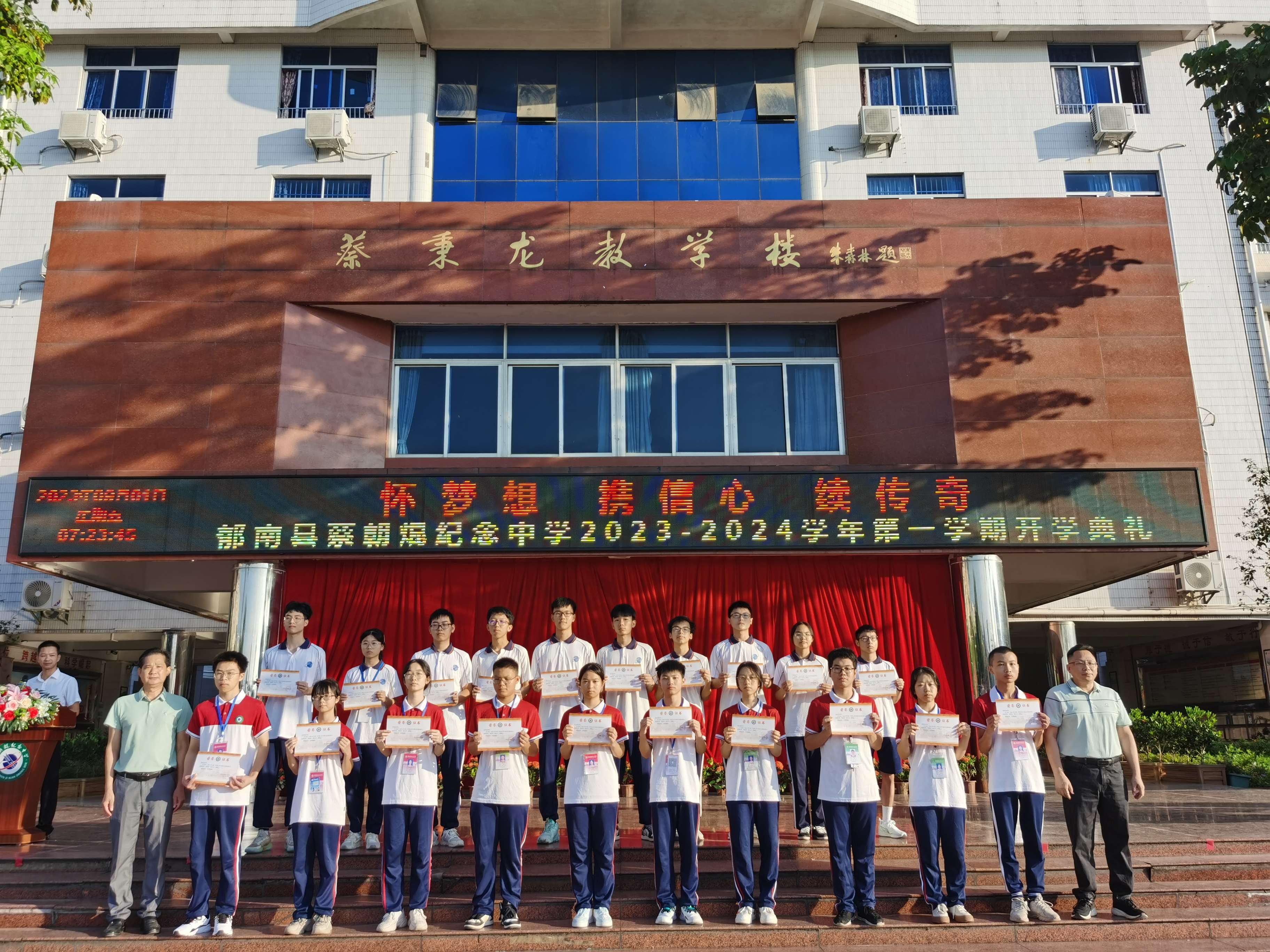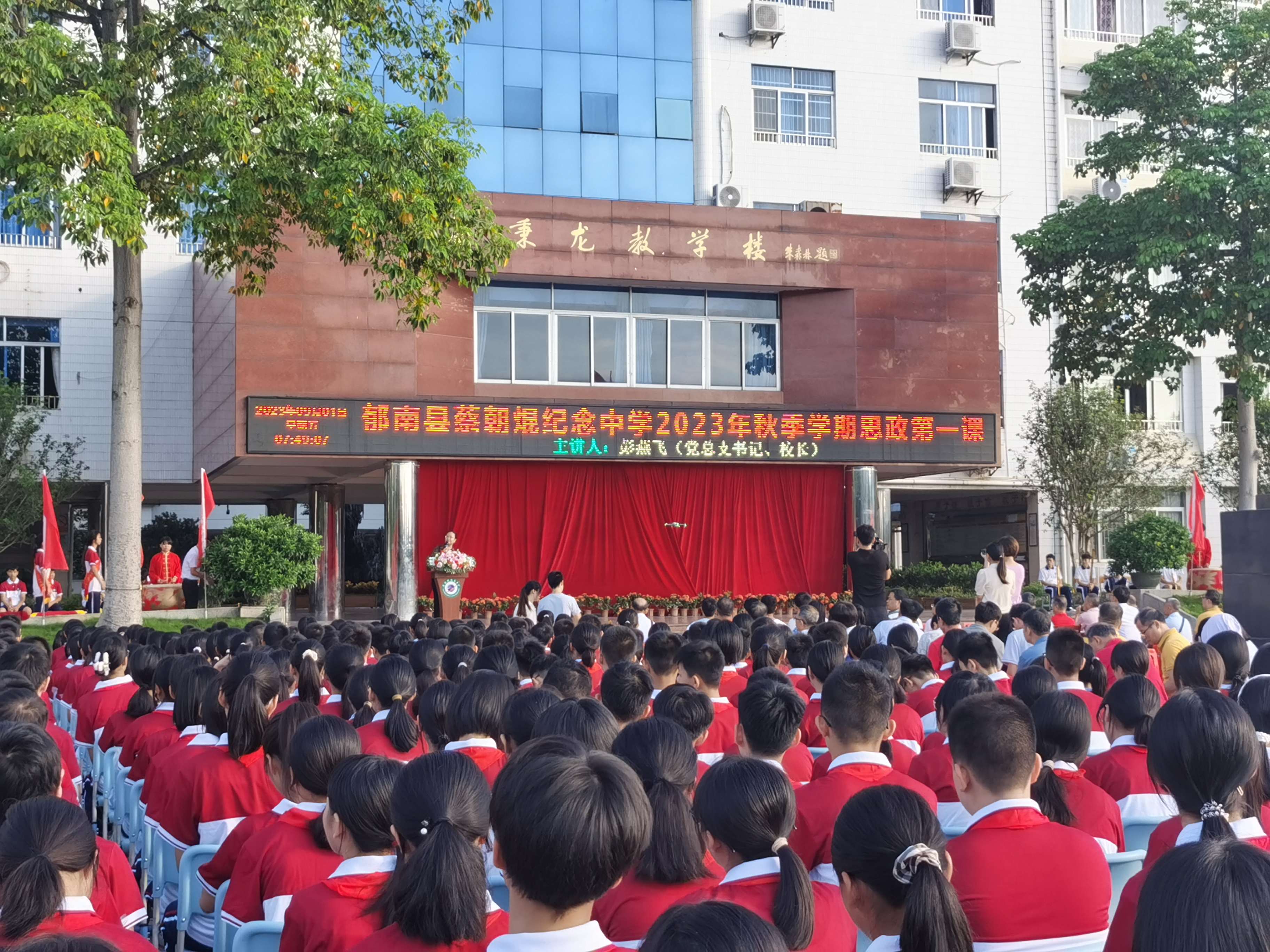2023年9月1日,蔡朝焜紀(jì)念中學(xué)2023--2024學(xué)年第一學(xué)期開學(xué)典禮在學(xué)校中心廣場(chǎng)舉行。郁南縣人民政府副縣長(zhǎng)楊桂平,郁南縣教育局黨組成員覃建南,蔡朝焜紀(jì)念中學(xué)黨總支書記、校長(zhǎng)彭燕飛,蔡朝焜紀(jì)念中學(xué)全體師生以及都城中學(xué)九年級(jí)師生參加了本次開學(xué)典禮。典禮由韋金富副校長(zhǎng)主持。