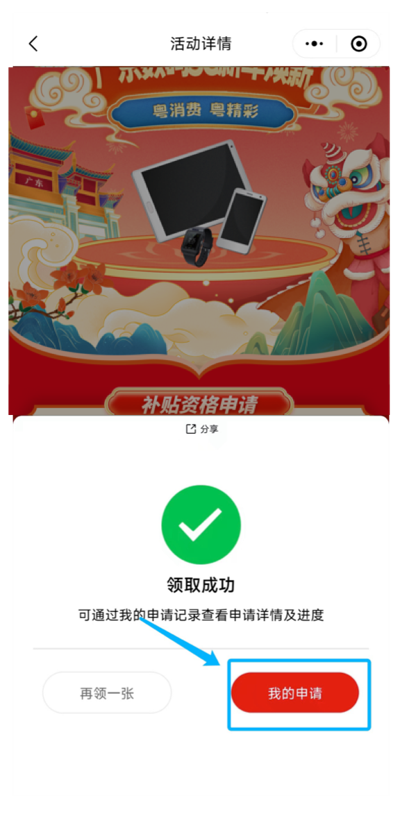步驟1:打開“我的申請”可查看領(lǐng)取成功的補(bǔ)貼資格
