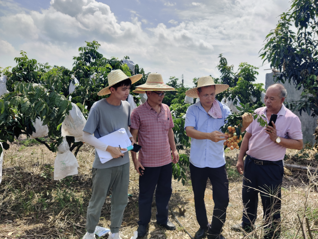 ▲圖為楊偉成(右二)與種植戶交流黃皮種植技術(shù)