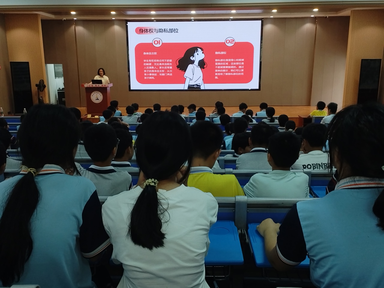 隨后,活動進入安全教育環(huán)節(jié)。陳主席為同學(xué)們帶來“青春護航,安全同行”主題講座。她圍繞防性侵、交通安全、網(wǎng)絡(luò)安全及防欺凌等重點內(nèi)容,通過情景模擬、知識問答等互動方式,生動講解各類安全風(fēng)險的防范與應(yīng)對措施,叮囑大家時刻保持警惕,增強自我保護意識和應(yīng)急處置能力。