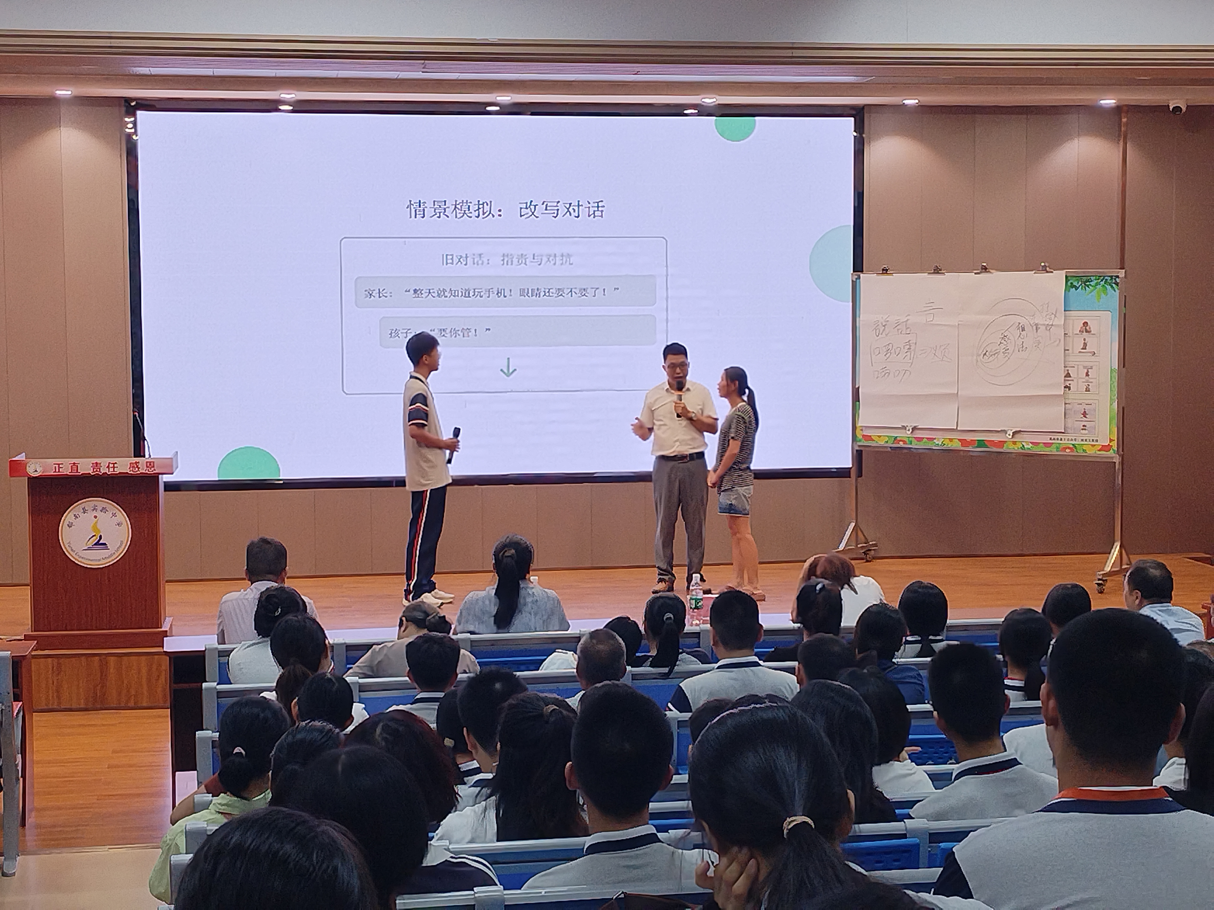 本次活動(dòng)特邀云浮市林文采家庭教育推廣中心創(chuàng)始人黃慶球老師主講,八年級(jí)200多名家長(zhǎng)和學(xué)生共同參與,圍繞青春期親子溝通這一主題展開(kāi)深入探討。