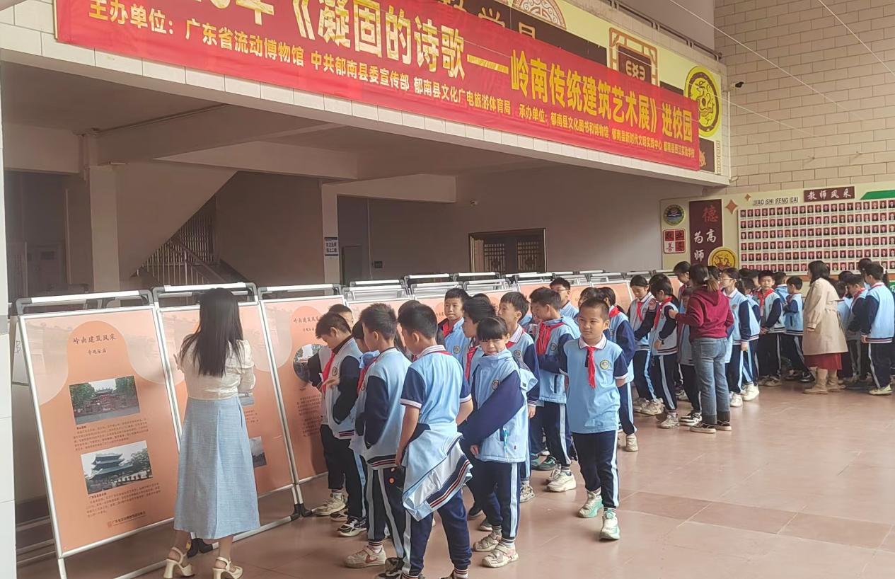 近日,由廣東省流動博物館、中共郁南縣委宣傳部郁南縣文化廣電旅游體育局主辦,郁南縣文化圖書和博物館、郁南縣新時代文明實踐中心、郁南縣西江實驗學校共同承辦的《凝固的詩歌——嶺南傳統(tǒng)建筑藝術圖片展》《探尋“最早廣東人”——磨刀山遺址圖片展》走進校園。