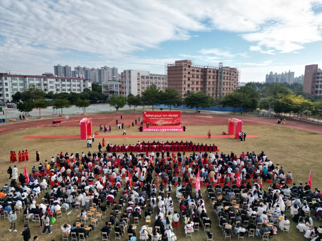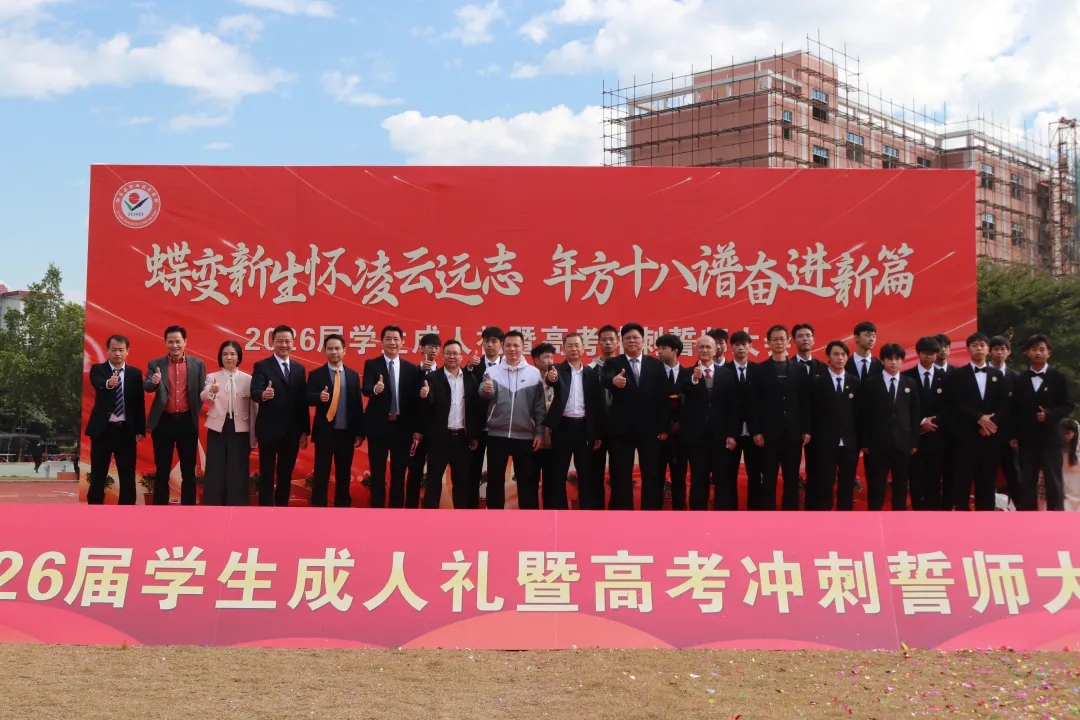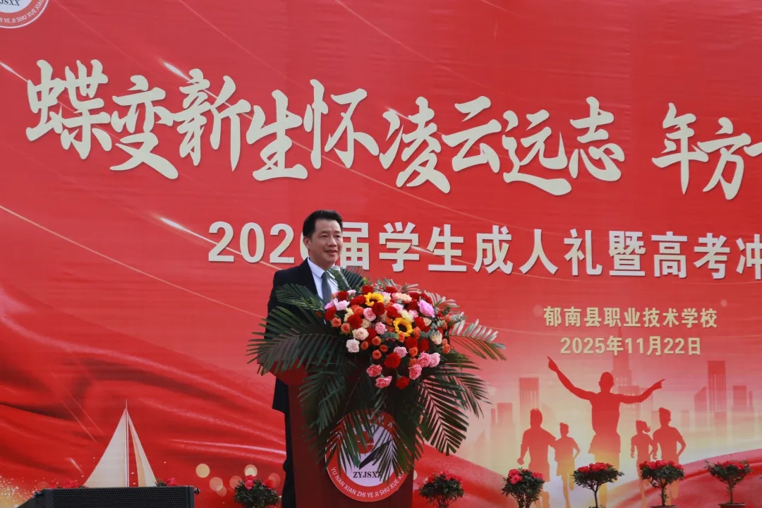 2025年11月22日上午,郁南縣職業(yè)技術(shù)學(xué)校足球場(chǎng)彩旗飄揚(yáng)、禮炮齊鳴,2026屆成人禮暨高考沖刺誓師大會(huì)隆重舉行。大會(huì)以“蝶變新生懷凌云遠(yuǎn)志,年方十八譜奮進(jìn)新篇”為主題,縣政府副縣長(zhǎng)溫伯榮、縣教育局副局長(zhǎng)吳卓堯等縣領(lǐng)導(dǎo)和局領(lǐng)導(dǎo),學(xué)校班子與中層行政,23級(jí)高考部全體師生及家長(zhǎng)代表共千余人齊聚現(xiàn)場(chǎng),共同見證這一莊重時(shí)刻。