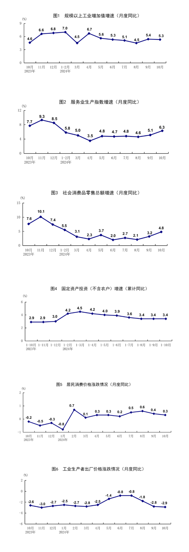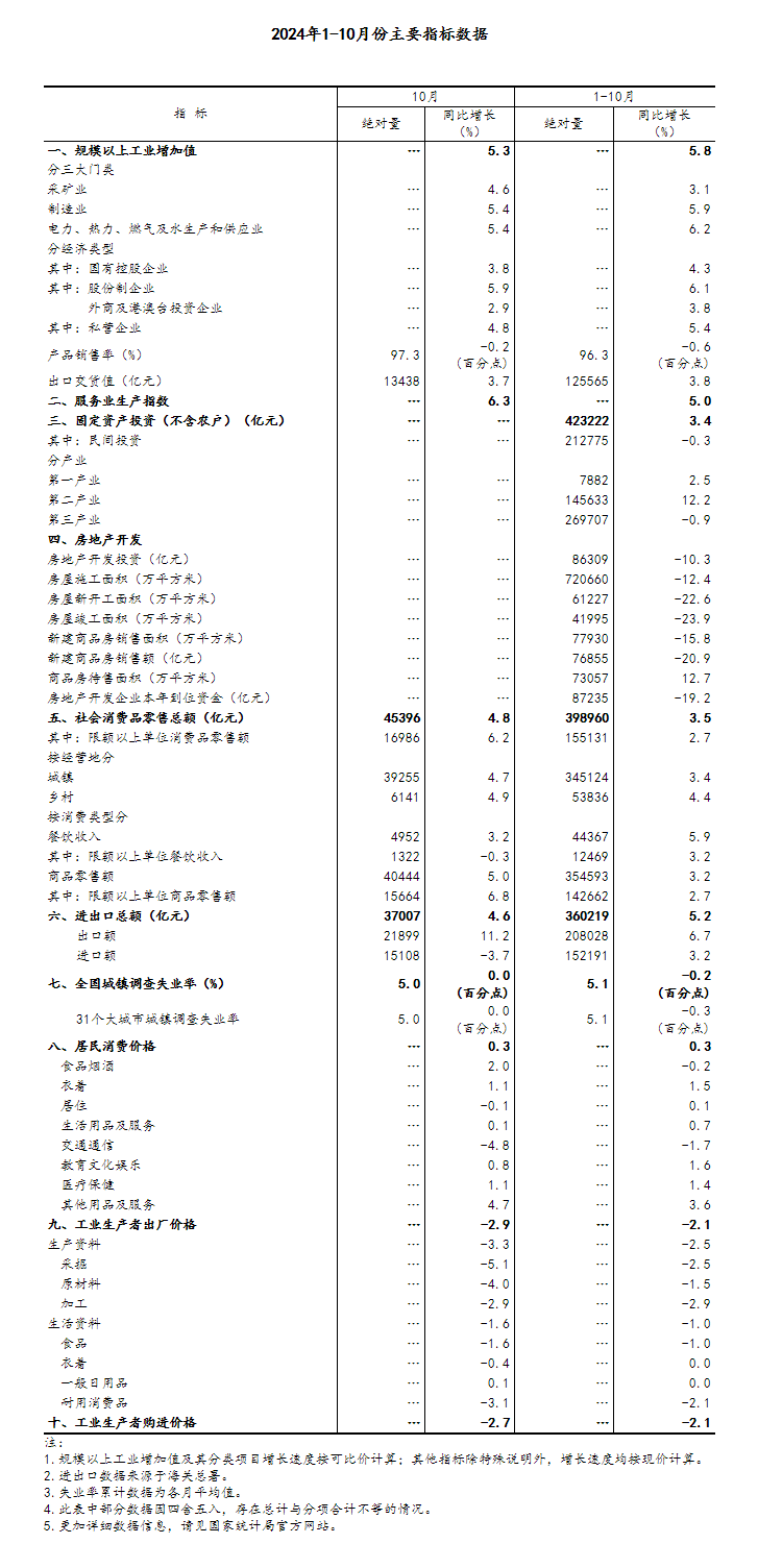 總的來看,10月份隨著存量政策加快落實以及一攬子增量政策加力推出,國民經(jīng)濟運行穩(wěn)中有進,主要指標明顯回升,積極因素累積增多。但也要看到,外部環(huán)境更趨復雜嚴峻,國內(nèi)有效需求偏弱,經(jīng)濟持續(xù)回升基礎(chǔ)仍待鞏固。下階段,要堅持以習近平新時代中國特色社會主義思想為指導,全面貫徹落實黨的二十大和二十屆二中、三中全會精神,堅持穩(wěn)中求進工作總基調(diào),完整、準確、全面貫徹新發(fā)展理念,扎實推進高質(zhì)量發(fā)展,加快構(gòu)建新發(fā)展格局,加力推進一攬子增量政策落地落實,鞏固和增強經(jīng)濟回升向好態(tài)勢,努力完成全年經(jīng)濟社會發(fā)展目標任務(wù)。