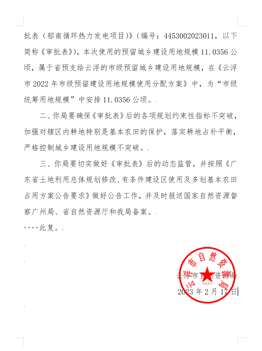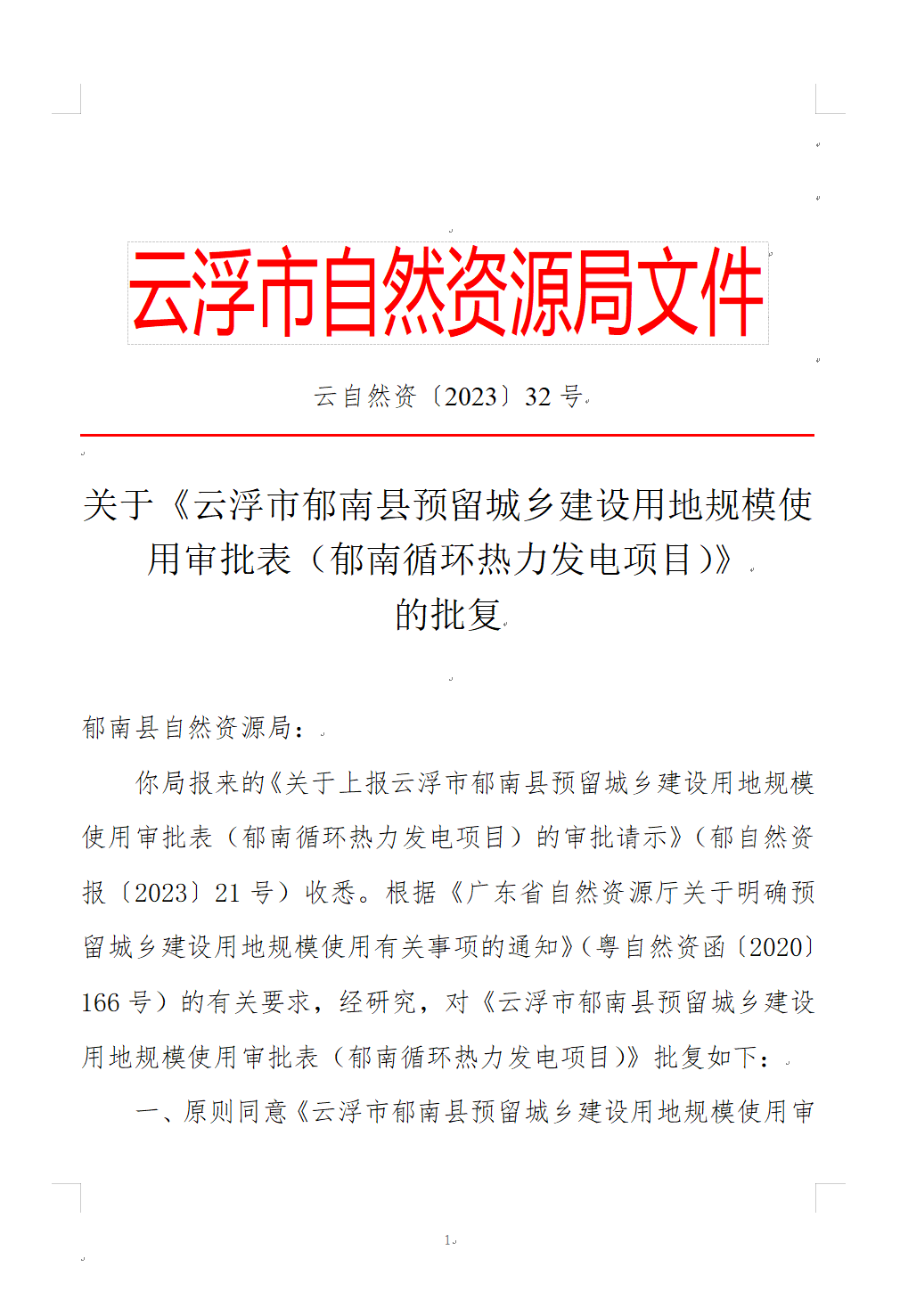 關(guān)于《云浮市郁南縣預(yù)留城鄉(xiāng)建設(shè)用地規(guī)模使用審批表(郁南循環(huán)熱力發(fā)電項(xiàng)目)》的批復(fù)(云自然資〔2023〕32號)。