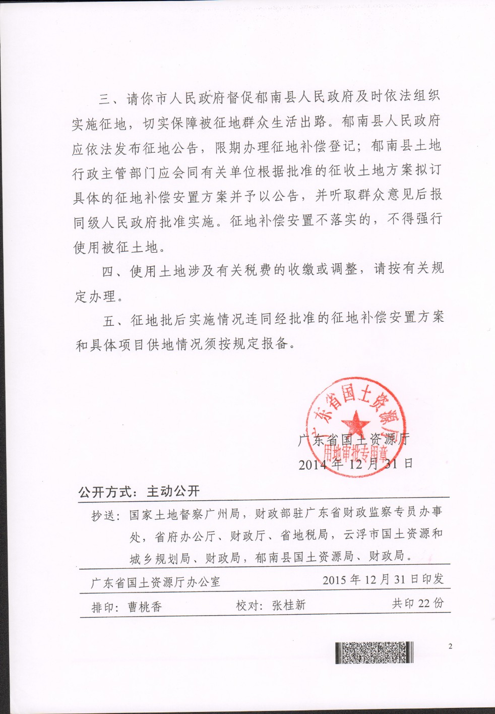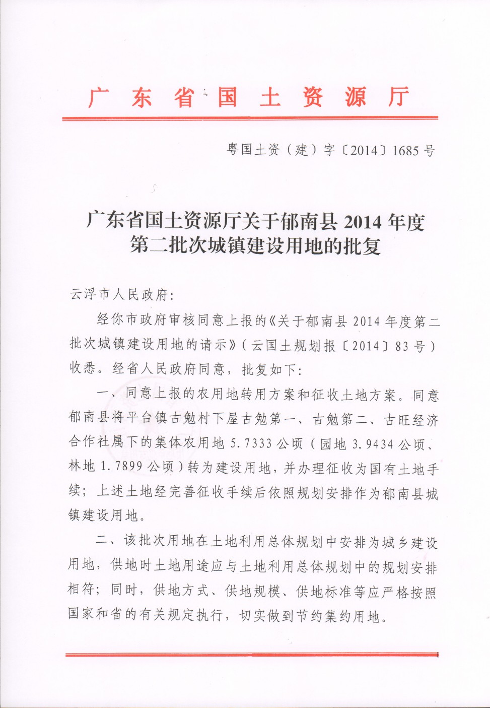 廣東省國土資源廳關(guān)于郁南縣2014年度第二批次城鎮(zhèn)建設(shè)用地的批復(fù)