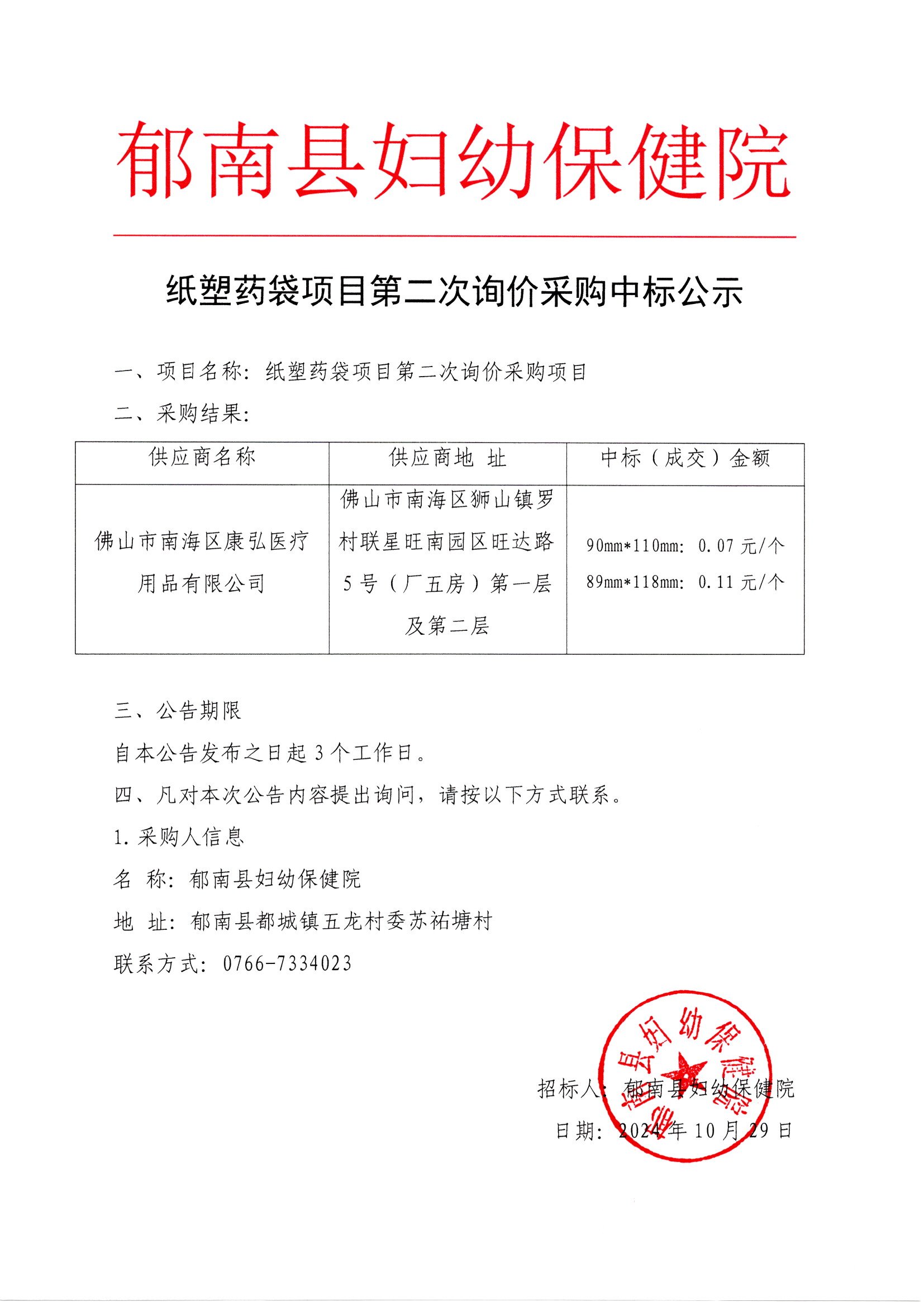 紙塑藥袋項(xiàng)目第二次詢價(jià)采購(gòu)中標(biāo)公示