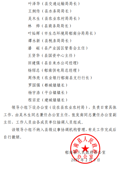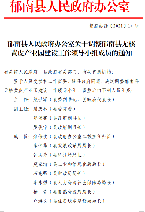 郁南縣人民政府辦公室關于調整郁南縣無核黃皮產業(yè)園建設工作領導小組成員的通知(郁府辦函〔2021〕14號)