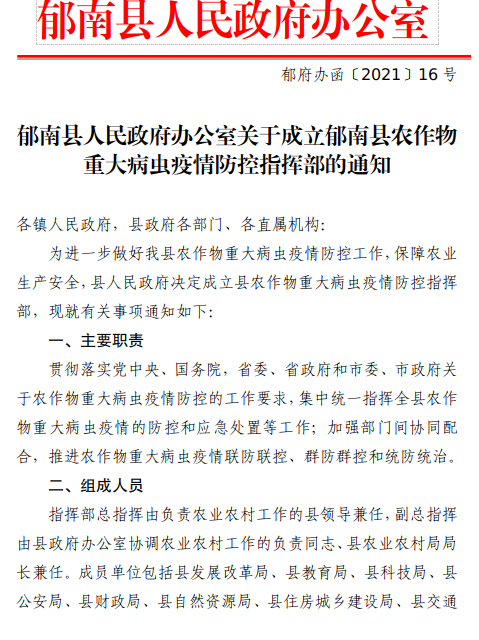 郁南縣人民政府辦公室關(guān)于成立郁南縣農(nóng)作物重大病蟲(chóng)疫情防控指揮部的通知(郁府辦函〔2021〕16號(hào))