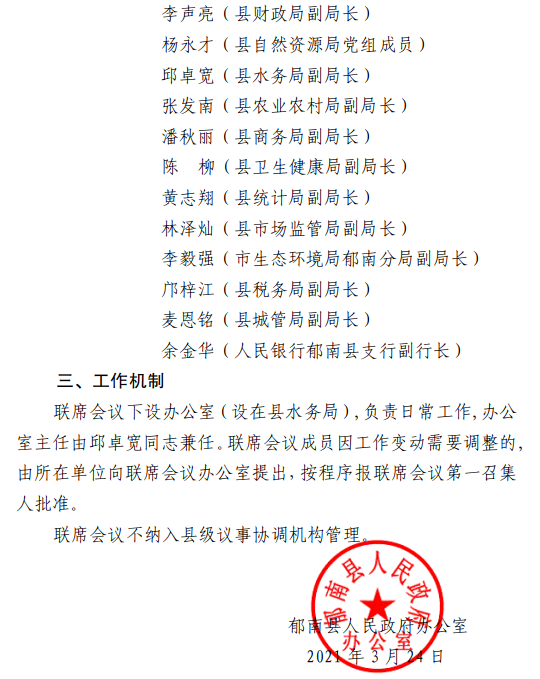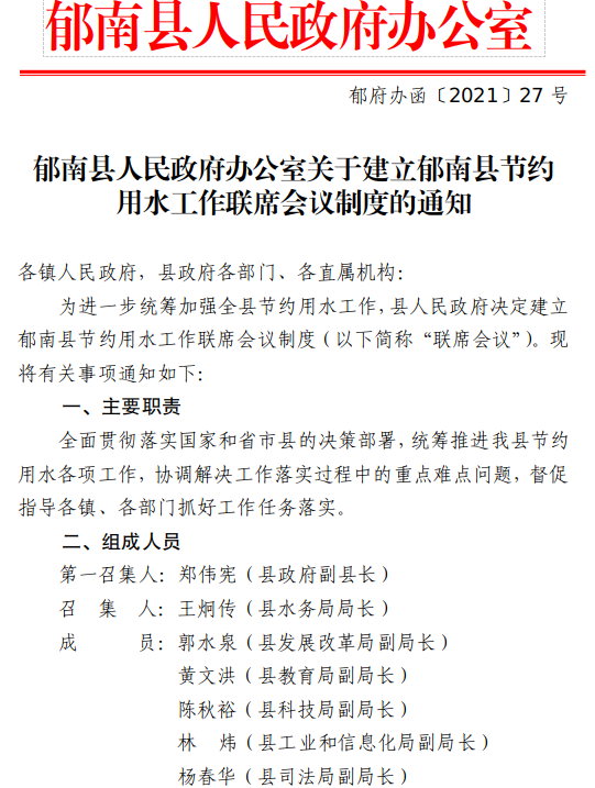 郁南縣人民政府辦公室關于建立郁南縣節(jié)約用水工作聯(lián)席會議制度的通知(郁府辦函〔2021〕27號)