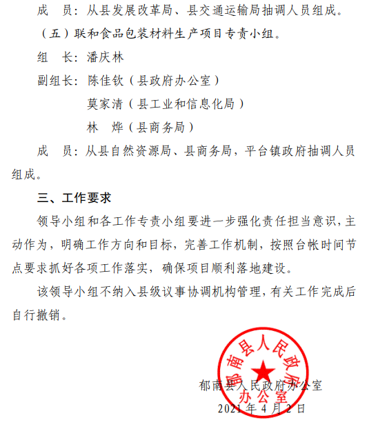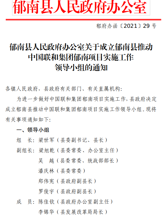 郁南縣人民政府辦公室關(guān)于成立郁南縣推動(dòng)中國(guó)聯(lián)和集團(tuán)郁南項(xiàng)目實(shí)施工作領(lǐng)導(dǎo)小組的通知(郁府辦函〔2021〕29號(hào))