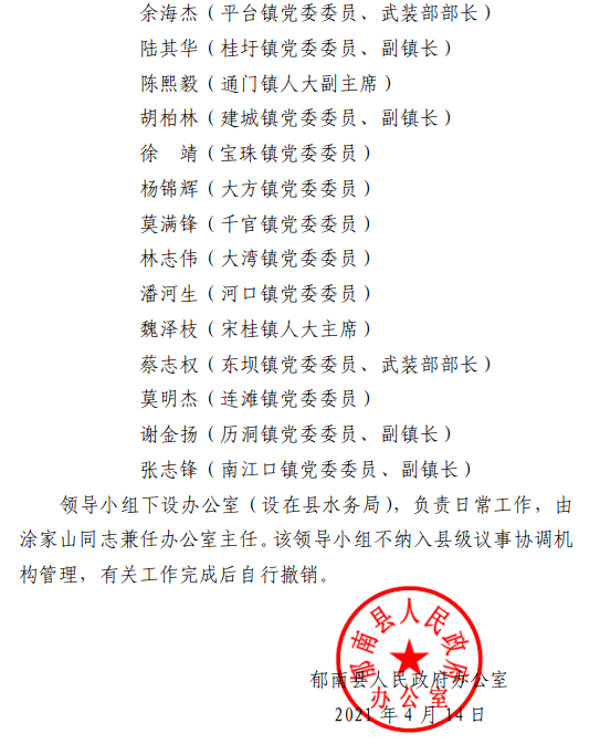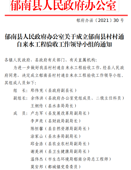 郁南縣人民政府辦公室關于成立郁南縣村村通自來水工程驗收工作領導小組的通知(郁府辦函〔2021〕30號)