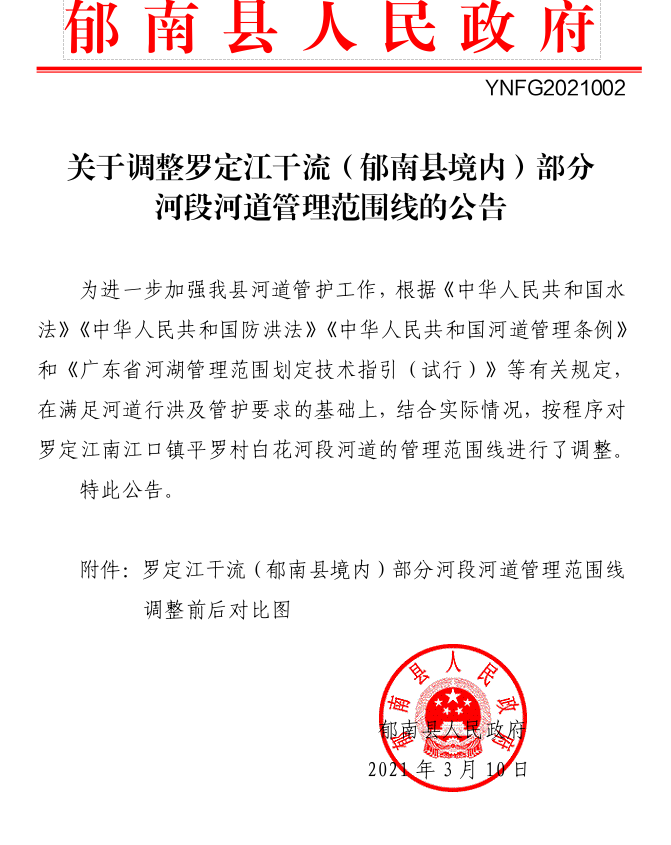 (規(guī)范性文件YNFG2021002)關(guān)于調(diào)整羅定江干流(郁南縣境內(nèi))部分河段河道管理范圍線的公告(章).doc